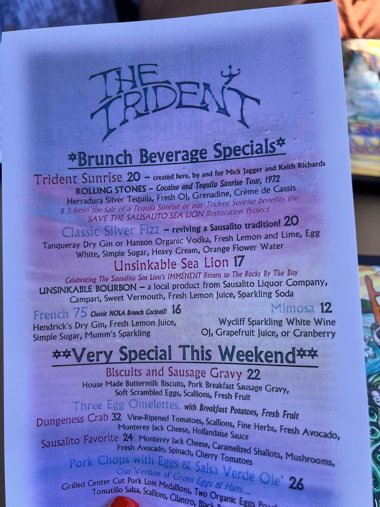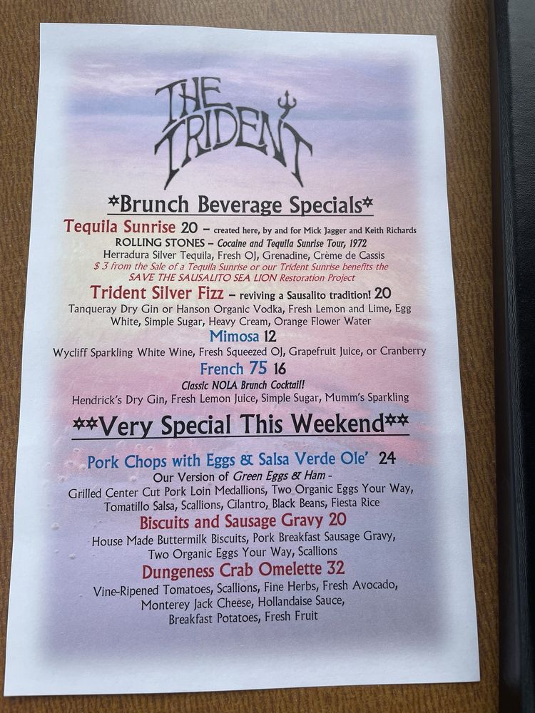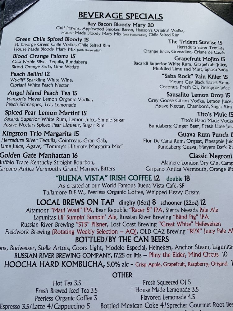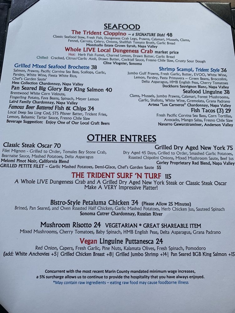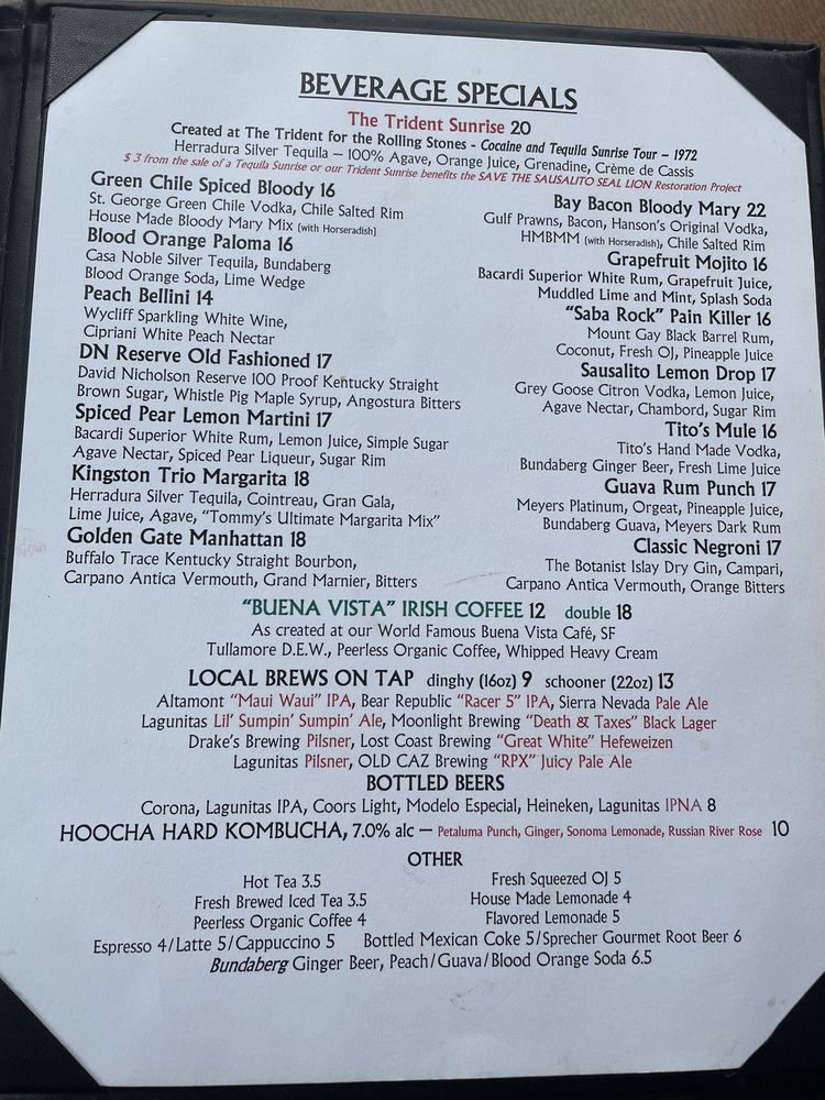 Introducing The Trident, a renowned restaurant located in Sausalito, CA. This casual dining spot offers a range of options from starters like creamy clam chowder and horseradish deviled eggs to mouth-watering sandwiches like the Trident Cheese Burger and Shrimp PO' Boy. Their seafood selection is a must-try, with dishes like The Trident Cioppino and Grilled Mixed Seafood Brochette. Customers rave about the beach vibes, vintage decor, and impressive bay views. The extensive drink menu and attentive service add to the overall dining experience. Don't miss the unique history of The Trident, with memorabilia from the Kingston Trio and stories of famous guests like The Rolling Stones. Dine in style at The Trident for a memorable culinary experience.