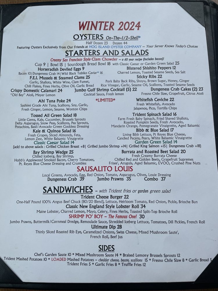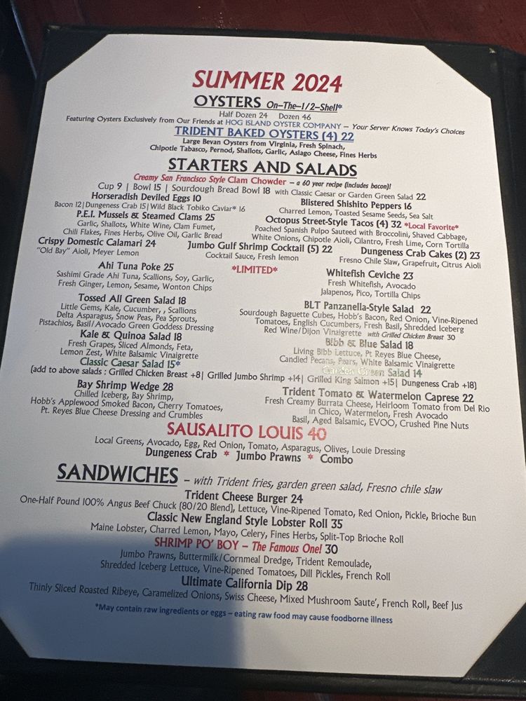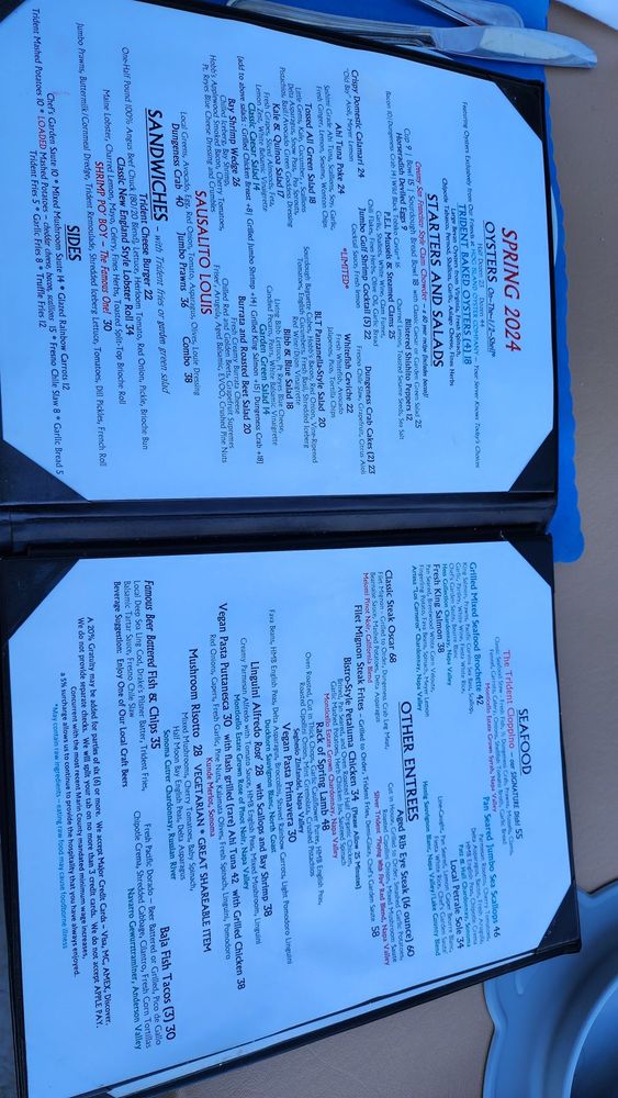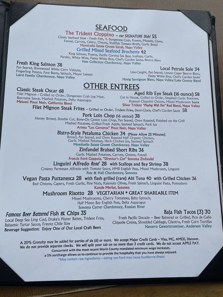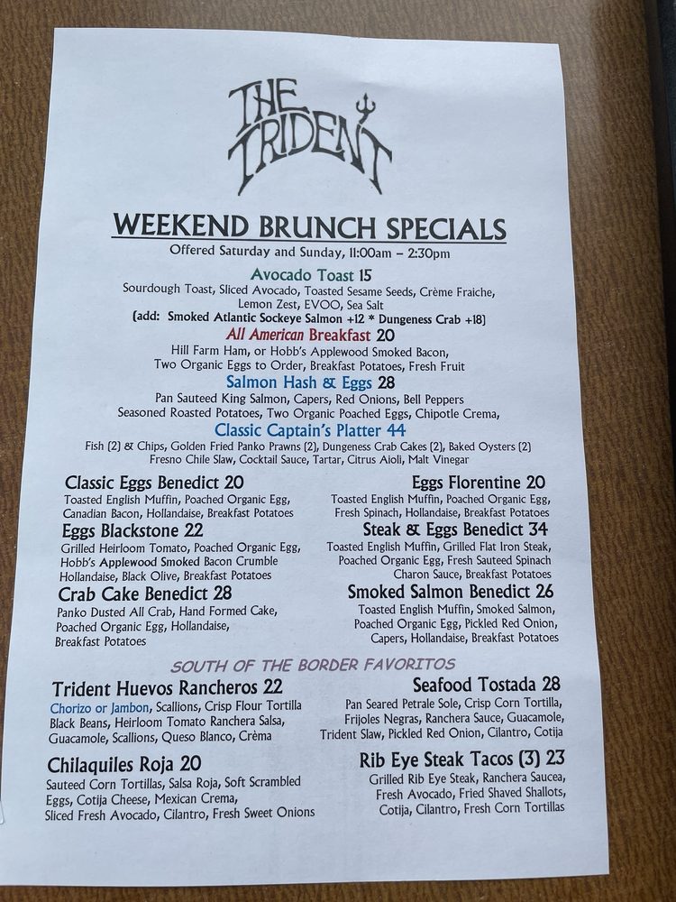 Introducing The Trident, a renowned restaurant located in Sausalito, CA. This casual dining spot offers a range of options from starters like creamy clam chowder and horseradish deviled eggs to mouth-watering sandwiches like the Trident Cheese Burger and Shrimp PO' Boy. Their seafood selection is a must-try, with dishes like The Trident Cioppino and Grilled Mixed Seafood Brochette. Customers rave about the beach vibes, vintage decor, and impressive bay views. The extensive drink menu and attentive service add to the overall dining experience. Don't miss the unique history of The Trident, with memorabilia from the Kingston Trio and stories of famous guests like The Rolling Stones. Dine in style at The Trident for a memorable culinary experience.