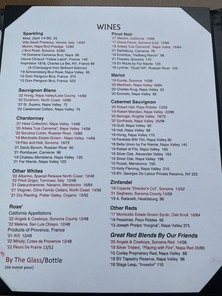 Classic Seafood Stew, Fresh Fish, Dungeness Crab Legs, Prawns, Calamari, Mussels, Clams, Fennel, Carrots, Celery, Onions, Shellfish Tomato Broth, Garlic Bread. Wine Suggestion: Saintsbury Pinot Noir, Carneros